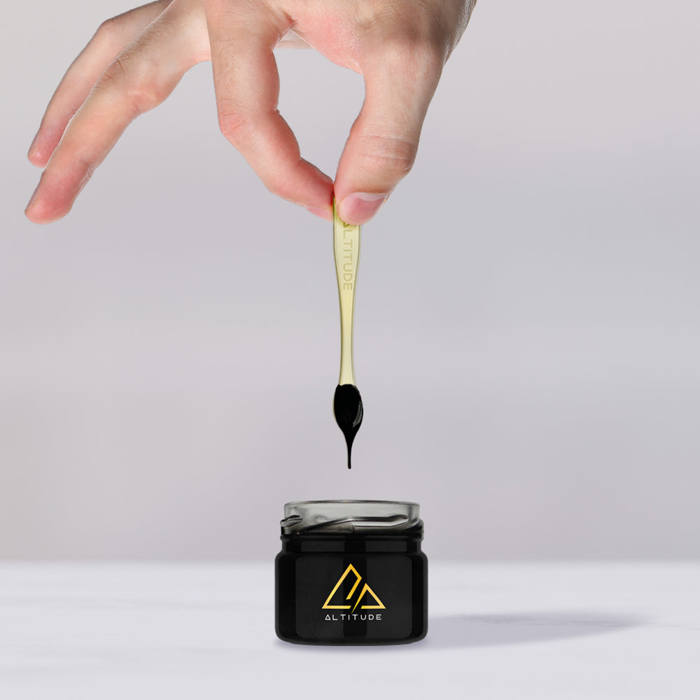 Using the measuring spoon provided, extract a pea size (250-500mg) portion of Shilajit resin from the jar.