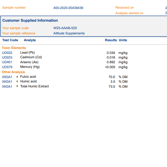Very low heavy metals and 70% fulvic acid with 73.5% total humic