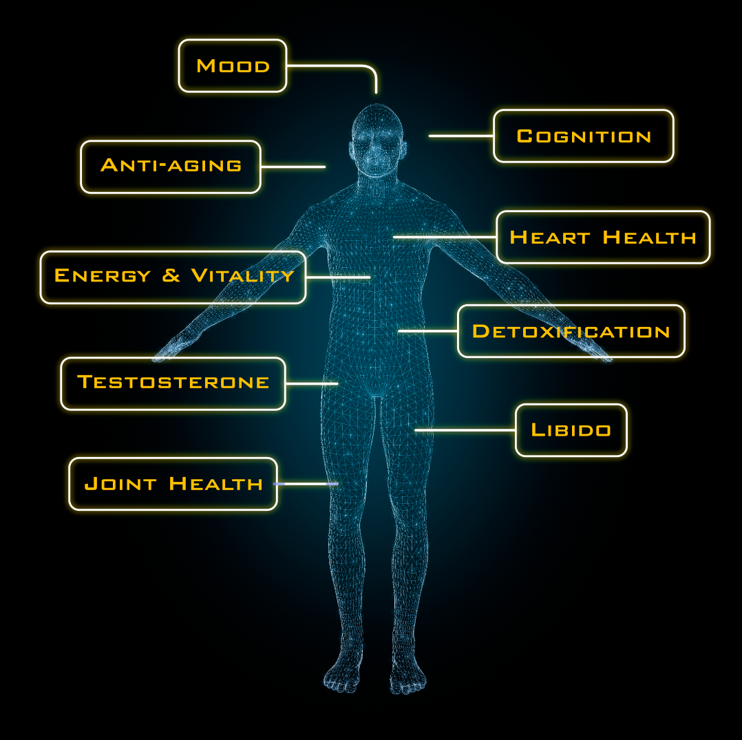 It supports mood, cognition, and heart health while promoting detoxification, libido, testosterone levels, joint health, anti-aging, energy, and overall vitality.